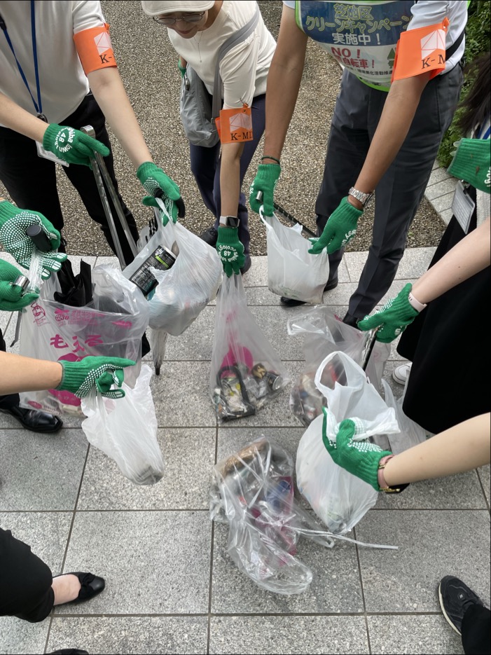 一見ゴミなんて落ちていないように見えても、歩道の植栽の下や、道路の端、公園のベンチ下などを隈無く見ていくと、タバコの吸い殻や弁当のゴミ、ビニール傘など大きなゴミもたくさんあります。また、参加賞として、オリジナルタオルや飲料などをいただきました。年2回開催されるため、今後も地域貢献活動の一環として、積極的に参加してまいります。