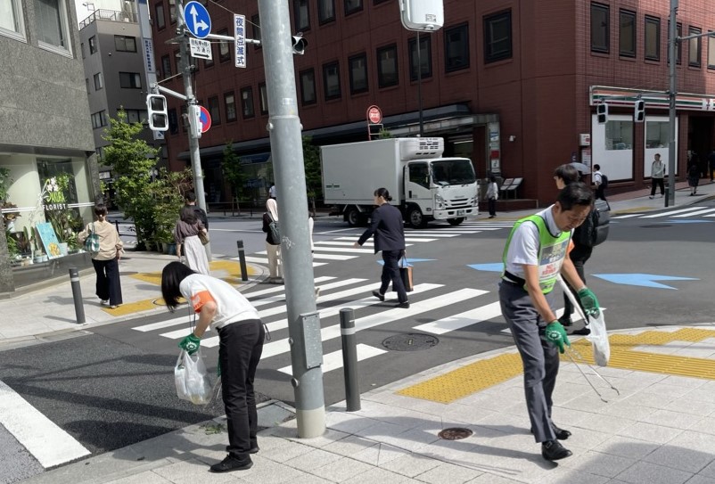 港区内で5つのブロックに分かれて実施され、私たちは本社の管轄である芝地区に参加。現地では、当社道路メンテナンス部門から参加の新井担当課長にもお会いしました。ゴミ拾いの用具、ゴミ袋などはすべて準備されているため、手ぶらでの参加が可能です。朝8時に虎ノ門ヒルズへ集合し、ゴミ袋とトングを借りて、準備ができた会社から順番にゴミ拾いを始めるというとても参加のしやすいイベントです。